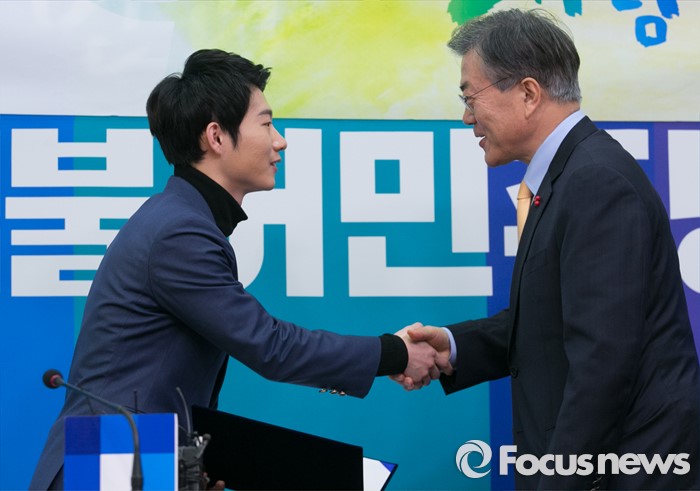 (서울=포커스뉴스) 문재인(오른쪽) 더불어민주당 대표가 21일 오후 서울 여의도 국회에서 열린 인재영입 기자회견에 참석해 세월호 참사 현장을 22일간 취재했던 부산 청년 오창석 씨와 악수를 하고 있다.