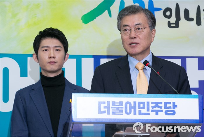 (서울=포커스뉴스) 문재인 더불어민주당 대표가 21일 오후 서울 여의도 국회에서 열린 인재영입 기자회견에 참석해 인사말을 하고 있다. 왼쪽은 세월호 참사 현장을 22일간 취재했던 부산 청년 오창석 씨.