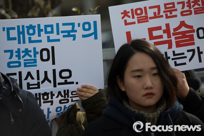 (서울=포커스뉴스) 한일 위안부 협상 폐기를 요구하며 주한일본대사관 앞 '평화의 소녀상' 인근에서 노숙 농성과 집회를 벌인 혐의로 출석요구서를 받은 대학생들이 21일 오후 서울 종로경찰서 앞에서 '소녀상을 지키는 대학생 표적수사 규탄 기자회견'을 하고 있다.