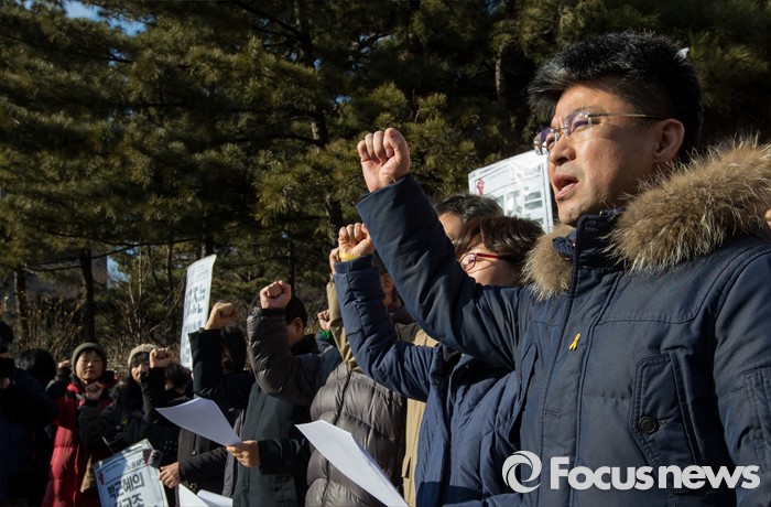 (서울=포커스뉴스) 21일 오후 서울 서초구 서울중앙지방법원 인근에서 열린 법외노조 통보처분 취소청구 고법 판결에 대한 전교조 입장 발표 기자회견에서 변성호 전국교직원노동조합 위원장 및 노조원들이 구호를 외치고 있다.