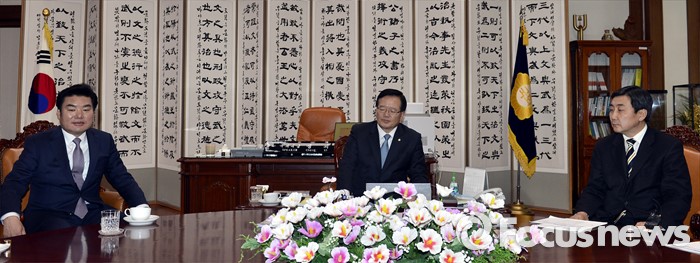 (서울=포커스뉴스) 정의화(가운데) 국회의장과 원유철(왼쪽) 새누리당 원내대표, 이종걸 더불어민주당 원내대표가 21일 오후 서울 여의도 국회 의장집무실에서 선거구 획정 및 국회법 개정안 등 쟁점 법안 처리를 위한 현안 논의를 하고 있다.