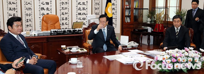 (서울=포커스뉴스) 정의화(가운데) 국회의장과 원유철(왼쪽) 새누리당 원내대표, 이종걸 더불어민주당 원내대표가 21일 오후 서울 여의도 국회 의장집무실에서 선거구 획정 및 국회법 개정안 등 쟁점 법안 처리를 위한 현안 논의를 하고 있다.