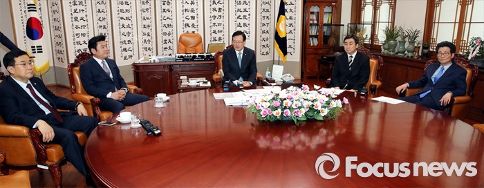 (서울=포커스뉴스) 여야 원내지도부가 21일 오후 서울 여의도 국회 의장집무실에서 정의화 국회의장 주재로 선거구 획정 및 국회법 개정안 등 쟁점 법안 처리를 위한 현안 논의를 하고 있다. 왼쪽부터 김정훈 새누리당 정책위의장, 원유철 원내대표, 정 의장, 이종걸 더불어민주당 원내대표, 이목희 정책위의장.