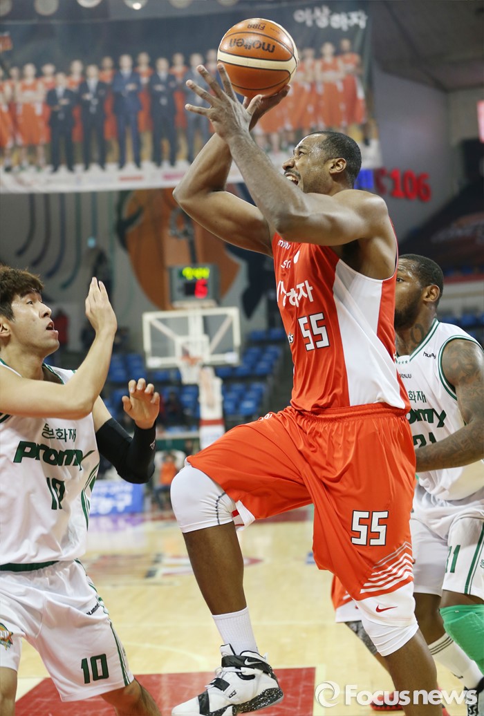 (서울=포커스뉴스) 21일 서울 잠실학생체육관에서 열린 2015-2016 프로농구 SK-동부 경기에서 SK 사이먼이 동부 김종범을 앞에 두고 점프슛을 시도하고 있다.