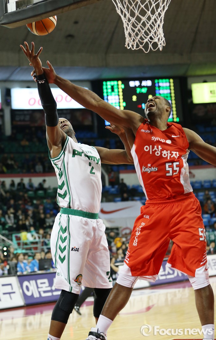 (서울=포커스뉴스) 21일 서울 잠실학생체육관에서 열린 2015-2016 프로농구 SK-동부 경기에서 동부 벤슨의 레이업슛을 SK 사이먼이 저지하고 있다.