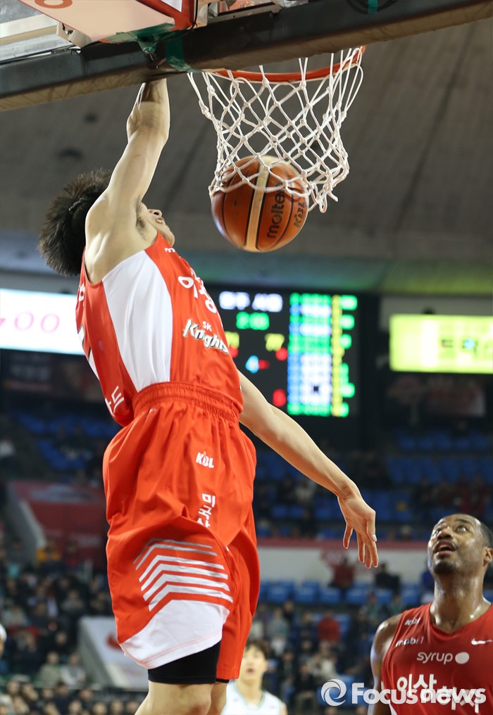 (서울=포커스뉴스) 21일 서울 잠실학생체육관에서 열린 2015-2016 프로농구 SK-동부 경기에서 SK 김선형이 원핸드 덩크슛을 성공시키고 있다.