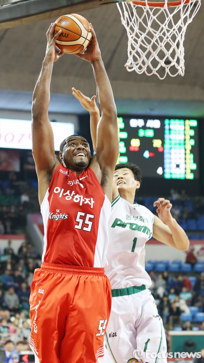 (서울=포커스뉴스) 21일 서울 잠실학생체육관에서 열린 2015-2016 프로농구 SK-동부 경기에서 SK 사이먼이 동부 한정원의 수비를 제치며 투핸드 덩크슛을 시도하고 있다.