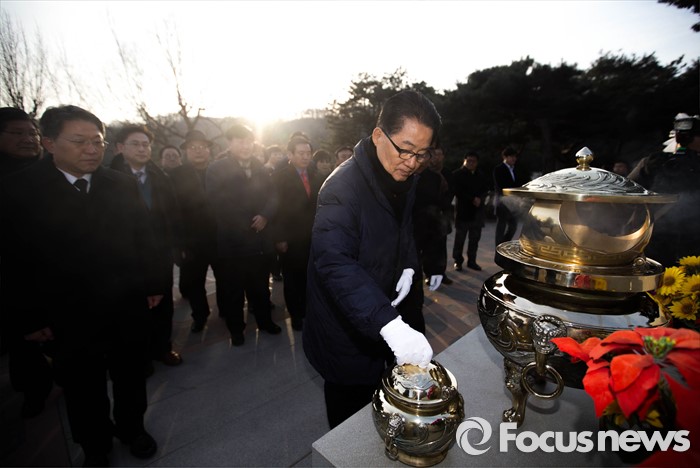 을서울=포커스뉴스) 더불어민주당 탈당을 예고한 박지원 전 원내대표가 22일 오전 서울 동작구 국립서울현충원 故 김대중 전 대통령 묘역을 방문해 분향을 하고 있다