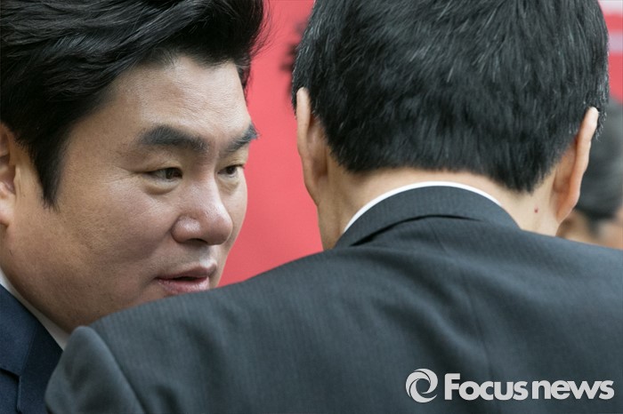 (서울=포커스뉴스) 원유철(왼쪽) 새누리당 원내대표와 심윤조 의원이 22일 오전 서울 여의도 국회에서 열린 원내대책회의에 참석해 귀엣말을 하고 있다.