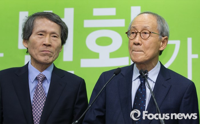(서울=포커스뉴스) 국민의당(가칭) 창당준비위원회 공동 위원장직을 수락한 후 2주 만에 모습을 드러낸 윤여준 전 장관(오른쪽)이 22일 오전 서울 마포구 국민의당 당사에서 기자회견을 하고 있다.