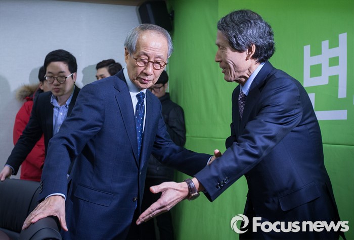 (서울=포커스뉴스) 윤여준(왼쪽), 한상진 국민의당 공동 창당준비위원장이 22일 오전 서울 마포구 당사에서 열린 기획조정회의에서 자리를 양보하고 있다.