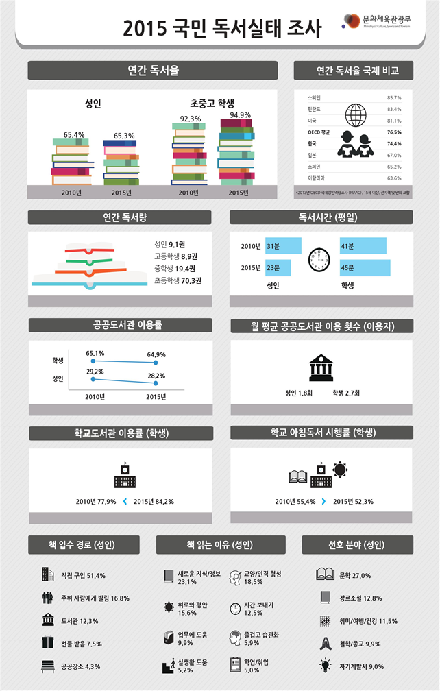 문화체육관광부는 전국의 19세 이상 성인 남녀 5000명과 초·중·고등학생 3000명을 대상으로 실시한 '2015년 국민 독서실태 조사' 결과를 발표했다. 결과에 따르면 지난 1년간 1권 이상의 일반도서(교과서․참고서․수험서․잡지․만화를 제외한 종이책)를 읽은 사람들의 비율은 성인 65.3%, 학생 94.9%인 것으로 나타났다. 이는 지난 2013년에 비해 성인은 6.1%, 학생은 1.1%가 감소한 수치다.