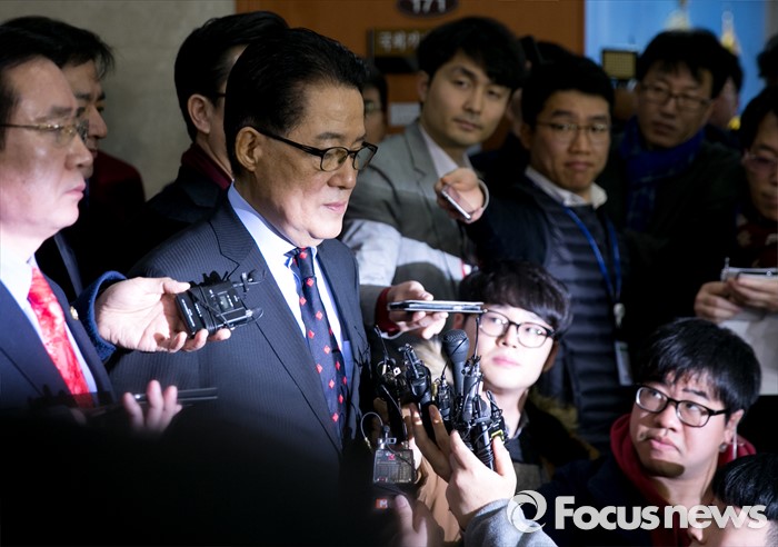 (서울=포커스뉴스) 박지원 더불어민주당 의원이 22일 오전 서울 여의도 국회 정론관에서 탈당 기자회견을 마친 뒤 취재에게 질문을 받고 있다.