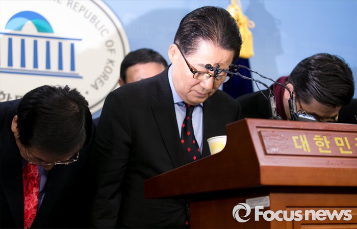 (서울=포커스뉴스) 박지원 더불어민주당 의원이 22일 오전 서울 여의도 국회 정론관에서 탈당 기자회견을 하고 있다.
