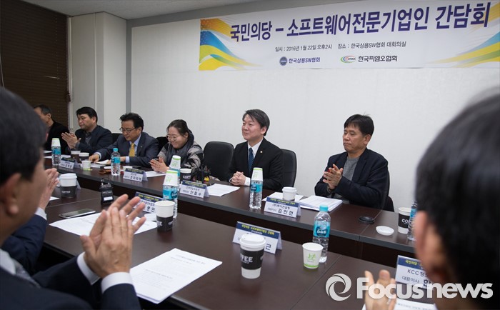 (서울=포커스뉴스) 국민의당(가칭) 안철수 의원(오른쪽 두번째)과 김영환 의원(왼쪽 두번째)이 22일 오후 서울 구로구 한국상용 SW협회에서 SW전문기업인과의 간담회를 갖고 있다.