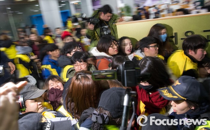 (서울=포커스뉴스) 22일 오후 서울 중구 서울고용노동청을 민원실을 점거한 알바노조원들이 경찰과 충돌하고 있다. 알바노조 조합원 100여명은 근로감독관 일처리 개선을 촉구하며 노동청을 기습 점거했다.