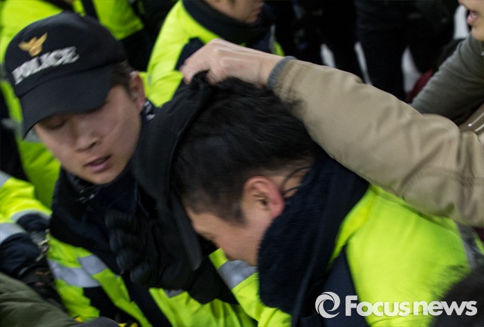 (서울=포커스뉴스) 22일 오후 서울 중구 서울고용노동청을 민원실을 점거한 알바노조원들이 경찰과 충돌하고 있다. 알바노조 조합원 100여명은 근로감독관 일처리 개선을 촉구하며 노동청을 기습 점거했다.
