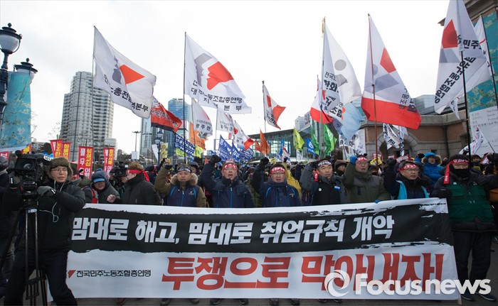 (서울=포커스뉴스) 23일 오후 서울역 광장에서 전국민주노동조합총연맹 회원들이 '민주노총 총파업 선포대회'를 하고 있다.