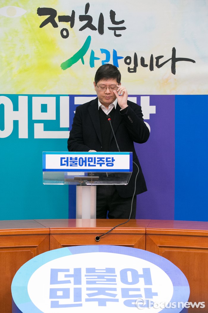 (서울=포커스뉴스) 김대중 전 대통령의 삼남 김홍걸 연세대 김대중 도서관 객원교수가 24일 오전 서울 여의도 국회 더불어민주당 당대표실에서 입당 기자회견을 하고 있다.