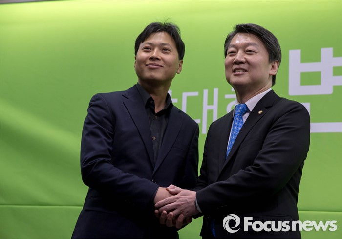 (서울=포커스뉴스) 24일 오전 서울 마포구 국민의당 당사에서 안철수(오른쪽) 인재영입위원장이 곽선우 변호사의 국민의당 공식 입당을 발표하고, 취재진 앞에서 곽 변호사와 함께 악수하고 있다.