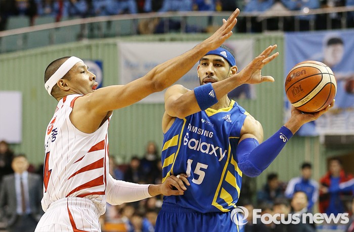 (서울=포커스뉴스) 24일 서울 잠실실내체육관에서 열린 2015-2016 프로농구 삼성-오리온 경기에서 삼성 문태영이 오리온 문태종의 마크를 받으며 패스를 시도하고 있다.