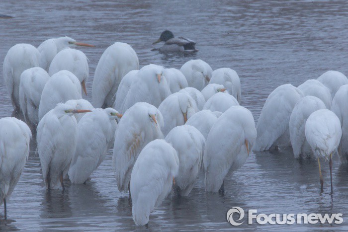 (서산=포커스뉴스)한파특보가 계속되고 있는 25일 오전 충남 천수만 해미천에서 겨울철새 대백로들이한자리에 모여 깃털을 부풀여 가슴에 따뜻한 공기를유지하면서 강추위를 피하고 있다.