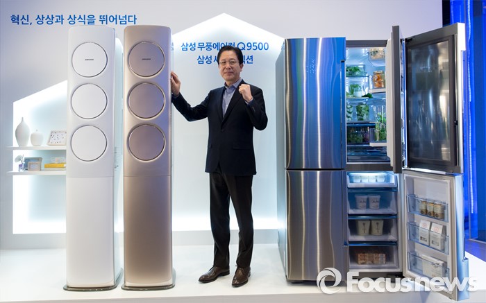 (서울=포커스뉴스) 25일 오전 서울 서초구 삼성딜라이트에서 서병삼 삼성전자 생활가전사업부장 부사장이 2016 삼성전자 생활가전 미디어데이에서 무풍에어컨 Q9500(왼쪽)과 셰프컬렉션 냉장고를 선보이고 있다.