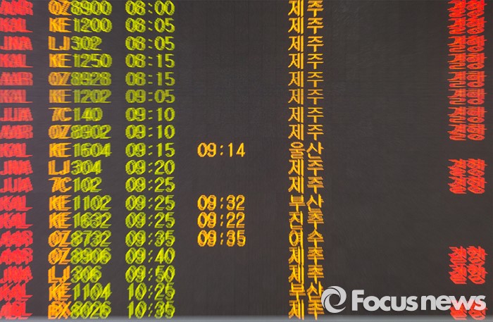 (서울=포커스뉴스) 25일 오전 서울 김포공항 국내선 청사에 제주에서 김포로 오는 항공편의 결항 안내문이 게시되고 있다.