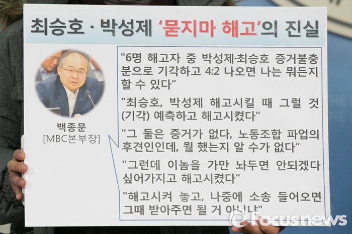 (서울=포커스뉴스) 국회 미래창조과학방송통신위원회 위원인 최민희 더불어민주당 의원이 25일 오전 서울 여의도 국회 정론관에서 지난 2012년 파업으로 해고된 MBC 최승호 PD, 박성제 기자와 관련된 백종문 MBC 미래전략본부장의 녹취록을 공개하고 있다. 녹취록에서 백 본부장은 '최 PD와 박 기자는 증거 없지만 해고 시킨 것'이라 말했다.