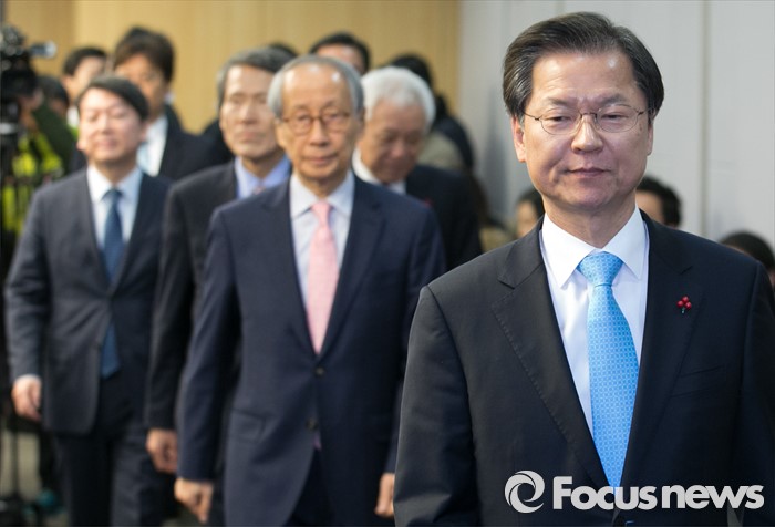 (서울=포커스뉴스) 25일 오전 서울 여의도 국회 의원회관에서 열린 국민의당-국민회의 통합발표 기자회견에 천정배(오른쪽부터) 국민회의 창당준비위원장, 김한길 국민의당 상임부위원장, 윤여준, 한상진 공동창당준비위원장, 안철수 인재영입위원장이 참석하고 있다.
