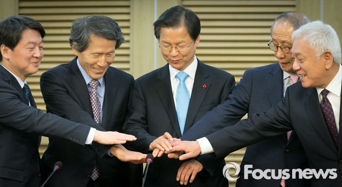 (서울=포커스뉴스) 25일 오전 서울 여의도 국회 의원회관에서 국민의당-국민회의 통합발표 기자회견을 마친 뒤 안철수(왼쪽부터) 국민의당 인재영입위원장, 한상진 공동창당준비위원장, 천정배 국민회의 창당준비위원장, 윤여준 국민의당 공동창당준비위원장, 김한길 상임부위원장이 취재진을 향해 포즈를 취하고 있다.