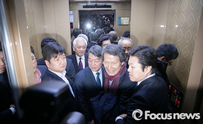 (서울=포커스뉴스) 25일 오전 서울 여의도 국회 의원회관에서 국민의당-국민회의 통합발표 기자회견을 마친 뒤 한상진, 윤여준 국민의당 공동창당준비위원장과 김한길 상임부위원장, 안철수 인재영입위원장이 승강기에 올라 이동하고 있다.