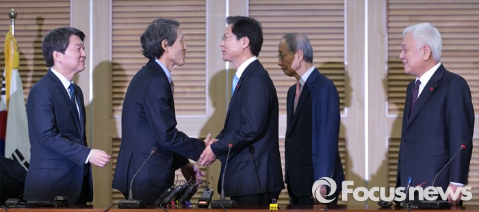 (서울=포커스뉴스) 25일 오전 서울 여의도 국회 의원회관에서 국민의당-국민회의 통합발표 기자회견을 마친 뒤 천정배 국민회의 창당준비위원장과 한상진 국민의당 공동창당준비위원장이 악수하고 있다. 왼쪽부터 안철수 국민의당 인재영입위원장, 한상진 공동창당준비위원장, 천정배 국민회의 창당준비위원장, 윤여준 국민의당 공동창당준비위원장, 김한길 상임부위원장.