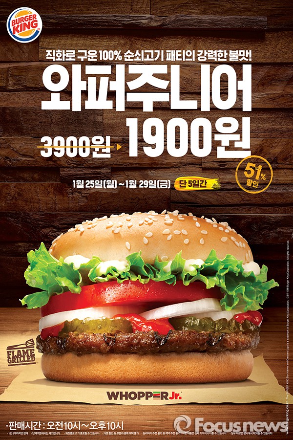 (서울=포커스뉴스) 버거킹은 오는 29일까지 5일간 와퍼 주니어 단품을 1900원에 판매한다.