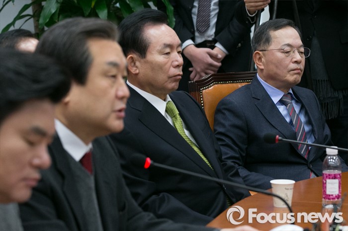 정 의장은 이에 대해 "잘못된 법을 고치는 데 있어서 또다른 잘못을 저질러서는 안된다"고 밝혔다.(서울=포커스뉴스) 지명직 최고위원에 임명된 안대희(오른쪽) 전 대법관이 25일 오전 서울 여의도 국회에서 열린 새누리당 최고위원회의에 참석해, 김무성(왼쪽 두번째) 대표의 모두발언을 경청하고 있다. 2016.01.25 박철중 기자