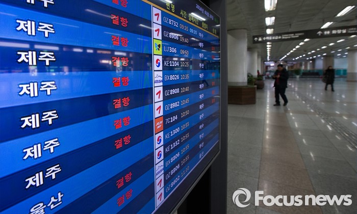 국토부는 “공항운항이 재개됐으나 항공사의 운항스케줄이 유동적이고 공항이 매우 혼잡할 것으로 예상된다”며 “승객들은 항공사에 예약상황과 운항현황을 미리 확인하고 공항으로 이동해 달라”고 당부했다.(서울=포커스뉴스) 25일 오전 서울 김포공항 국내선 청사에 제주에서 김포로 오는 항공편의 결항 안내문이 게시되고 있다.2016.01.25 오장환 기자