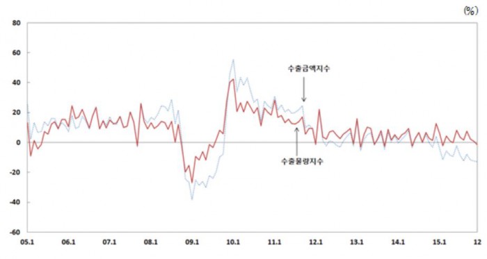 연간치로 비교해도 작년 수출금액지수는 큰 폭 하락했다. 2015년 수출금액지수 연간치는 -9.0%로 2009년 -16%기록 이후 가장 크게 떨어졌다.