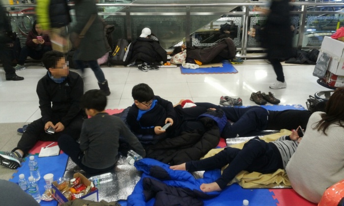 (서울=포커스뉴스) 32년 만에 폭설로 제주국제공항이 폐쇄된지 3일째 되는 25일 오전 제주국제공항 대합실에 모인 관광객들이 운항 재개를 기다리며 바닥에 누워 있다.