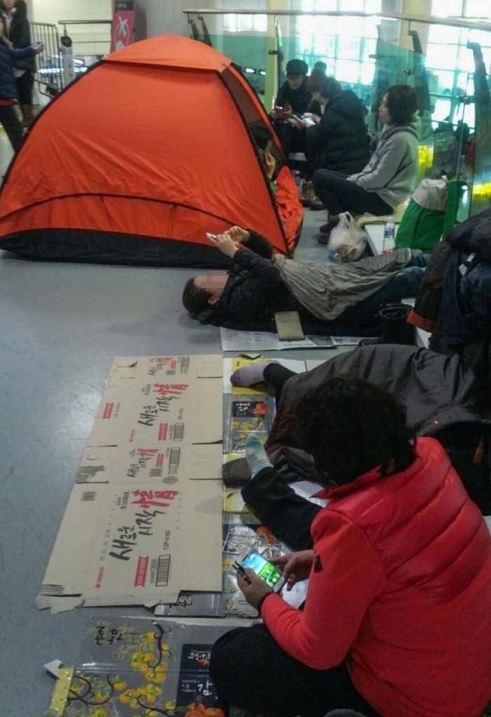 (서울=포커스뉴스) 32년 만에 폭설로 제주국제공항이 폐쇄된지 3일째 되는 25일 오후 제주국제공항 대합실에 모인 관광객들이 항공권을 발권하기 기다리고 있다. 국토교통부는 25일 오후 12시를 기해 운항을 재개한다고 밝혔다. 하지만 항공기에 쌓인 눈을 제거하는 등 작업들이 남아 있어 실제적인 운항재개는 오후 3시부터 이루어질 전망이다. <사진제공=김세희 사진가>