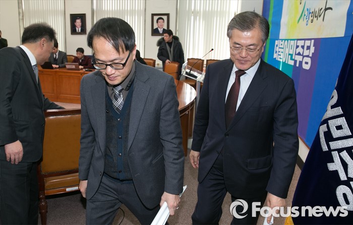 (서울=포커스뉴스) 문재인(오른쪽) 더불어민주당 대표가 25일 오후 서울 여의도 국회에서 열린 세월호 유가족 법률 대리인 등으로 활약한 박주민 전 민변 사무처장 인재영입 기자회견을 마친 뒤 퇴장하고 있다.