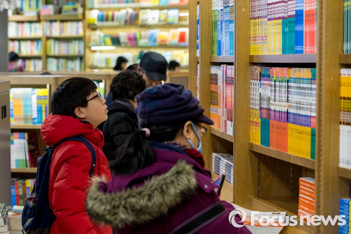 (서울=포커스뉴스) 서울 한 낮 기온이 영하권에 머물며 연일 강추위가 이어지고 있는 25일 오후 서울 종로구 교보문고 광화문점에서 개학을 앞둔 중고생들과 학부모들이 참고서를 보고 있다.