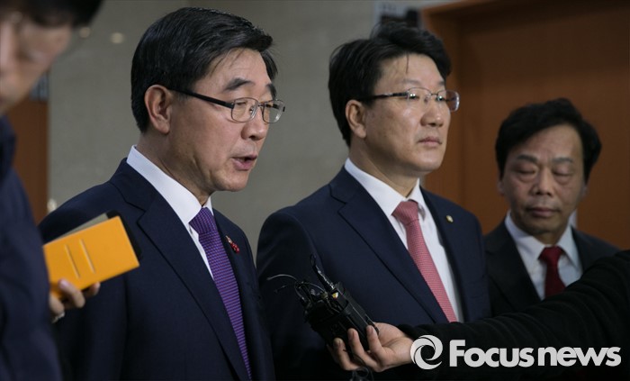 (서울=포커스뉴스) 이기권 고용노동부 장관과 새누리당 노동선진화특위원장 소속 권성동, 이완영 의원이 25일 오후 서울 여의도 국회 정론관에서 노동개혁 2대 지침(일반해고 지침, 취업규칙 지침) 설명회를 마친 뒤 브리핑을 하고 있다.