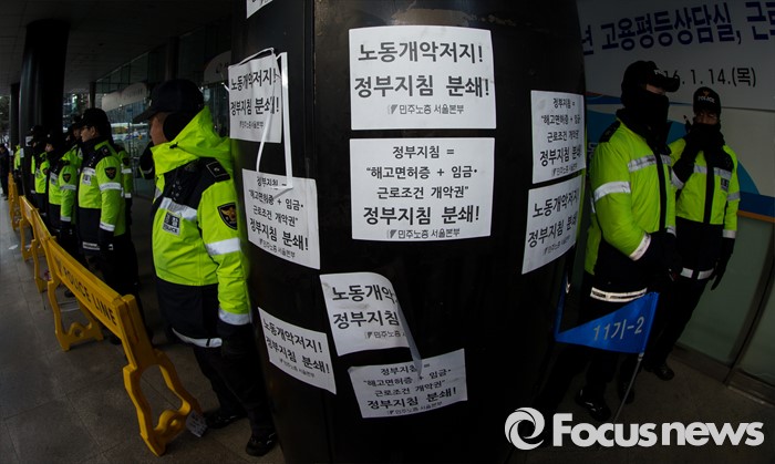 (서울=포커스뉴스) 25일 오후 서울 중구 지방고용노동청 앞에서 열린 '민주노총 수도권 총파업 결의대회'에 참가한 노조원이 노동청 벽에 붙인 항의 스티커들.