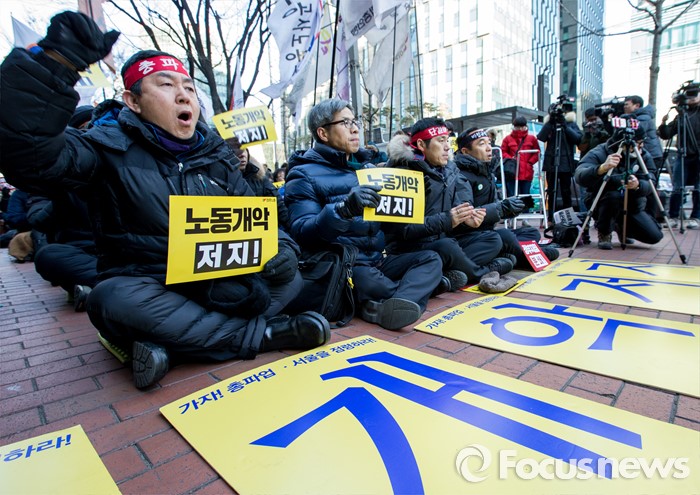 (서울=포커스뉴스) 25일 오후 서울 중구 지방고용노동청 앞에서 열린 '민주노총 수도권 총파업 결의대회'에 참가한 노조원이 구호를 외치고 있다.