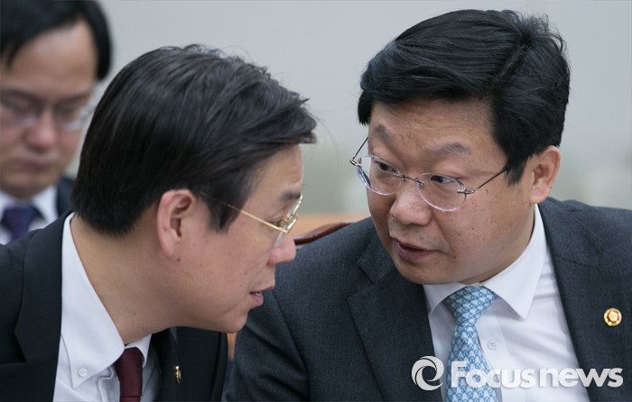 (서울=포커스뉴스) 25일 오후 서울 여의도 국회에서 열린 산업통상자원위원회 전체회의에 참석한 주형환(오른쪽) 산업통상자원부 장관과 이관섭 1차관이 대화하고 있다.
