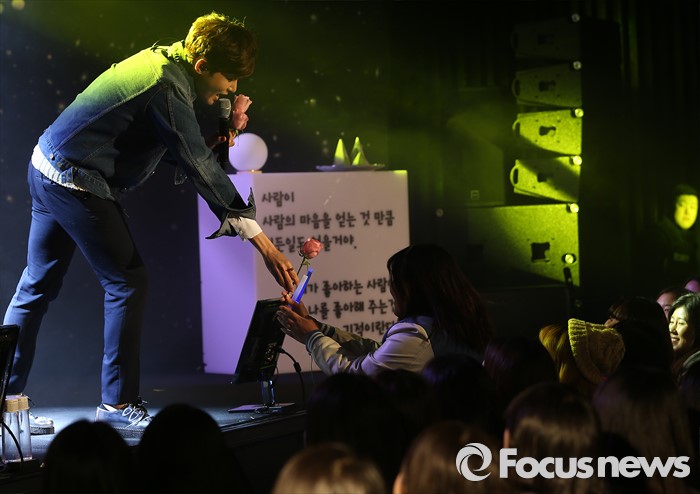 (서울=포커스뉴스) 25일 오후 서울 용산구 현대카드 언더스테이지에서 열린 미니앨범 '어린왕자' 쇼케이스에 참석한 가수 려욱이 신곡 '그대'의 무대를 선보이던 중 한 팬에게 꽃을 건내고 있다.