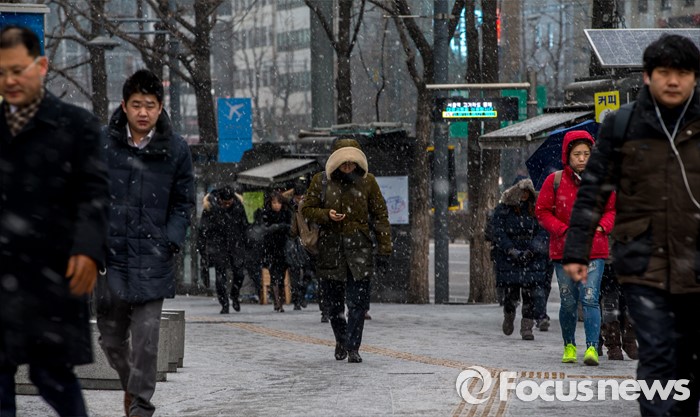 (서울=포커스뉴스) 서울 지역에 눈이 내리고 있는 26일 오전 서울 중구 남대문 일대에서 직장인들이 내리는 눈을 맞으며 출근길을 재촉 하고 있다.