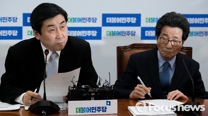 (서울=포커스뉴스) 이종걸(왼쪽) 더불어민주당 원내대표가 26일 오전 서울 여의도 국회에서 열린 원내대책회의에 참석해 모두발언을 하고 있다.