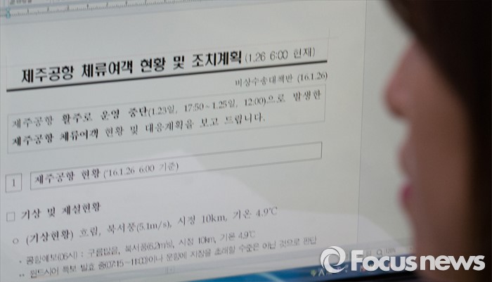 (세종=포커스뉴스) 26일 오전 세종시 정부세종청사 국토교통부 제주공항체류여객 비상수송대책본부에서 관계자들이 제주도 인근 운항상황을 점검하고 있다.