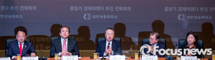 (서울=포커스뉴스) 박용만(가운데) 대한상공회의소 회장을 비롯한 여야정 대표들이 26일 오전 서울 중구 대한상공회의소 국제회의장에서 열린 '중장기 경제어젠다 추진 전략회의'에 자리해 박수 치고 있다. 이날 회의에 자리한 여야정 대표 및 산학연 대표 70여명은 규제 근본 틀 개선, 기업문화 개선, 국민 행복 위한 서비스 발전 등을 논의 할 예정이다.